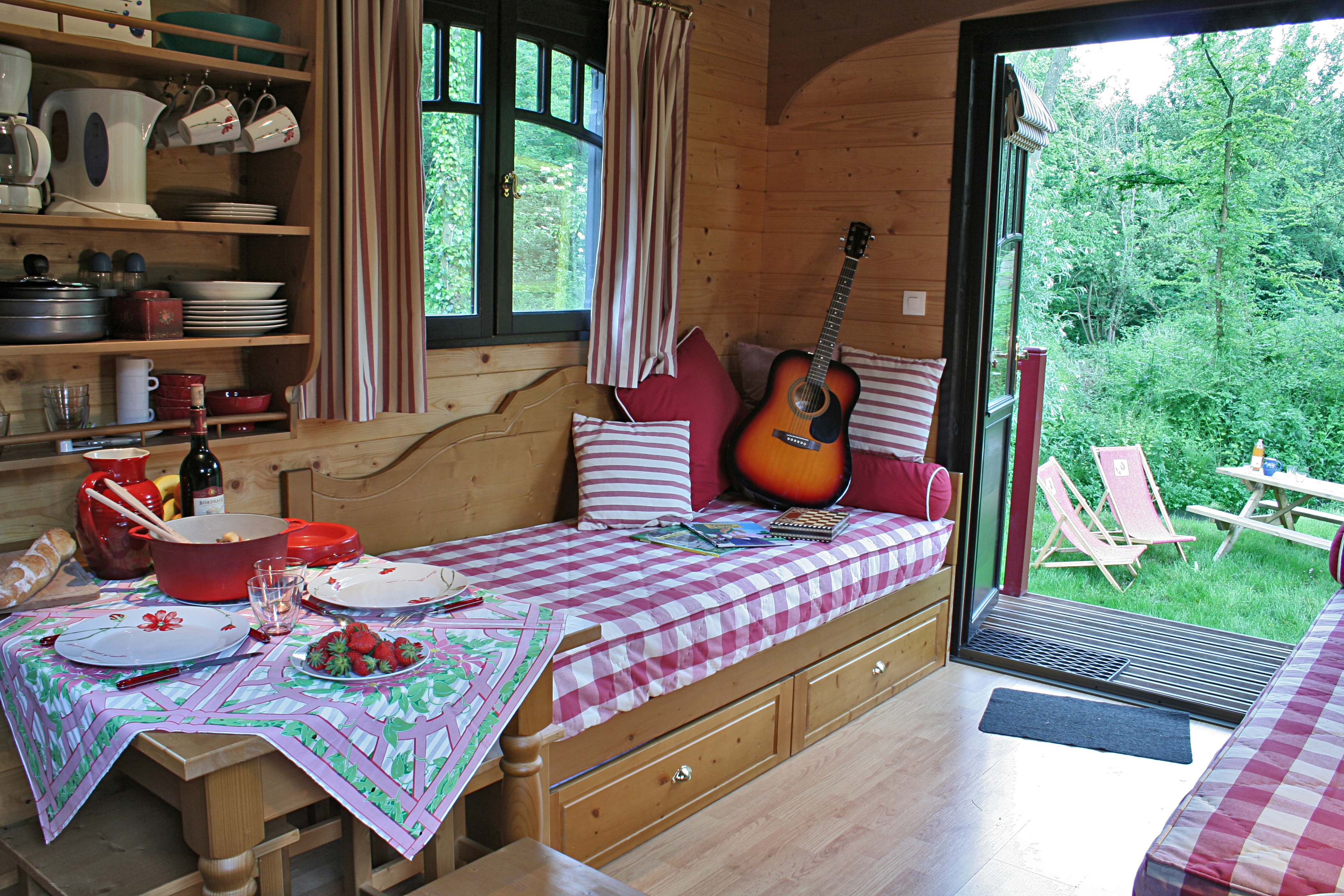 - 4 roulottes (2 à 5 personnes chacune) : 1 lit double et 2 lits-banquette + 1 lit gigogne (sur demande, en supplément) chacune