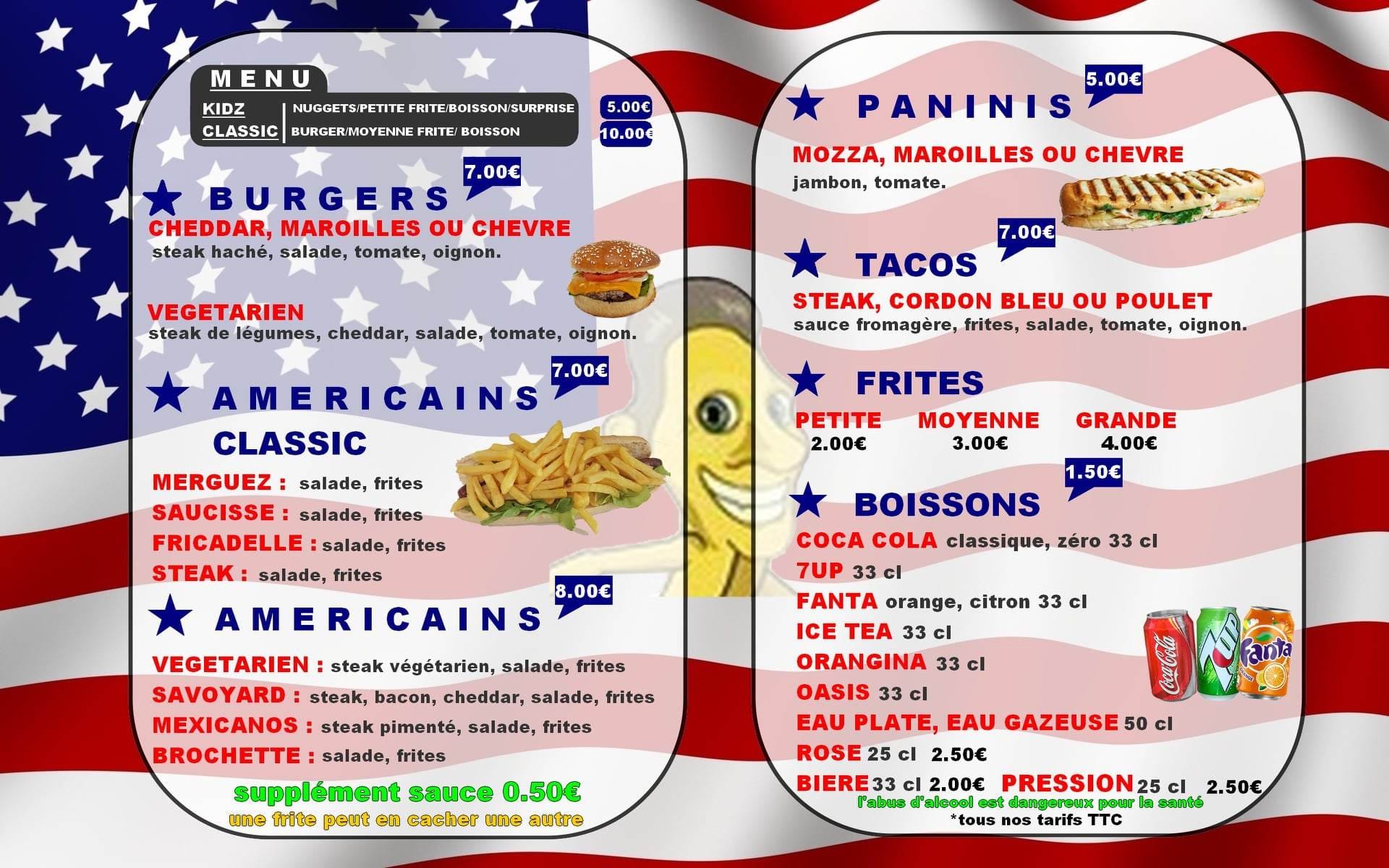Tony vous propose de déguster ses burgers, ses américains, ses paninis ou encore ses frites accompagnées d'un large choix de sauces et de boissons !